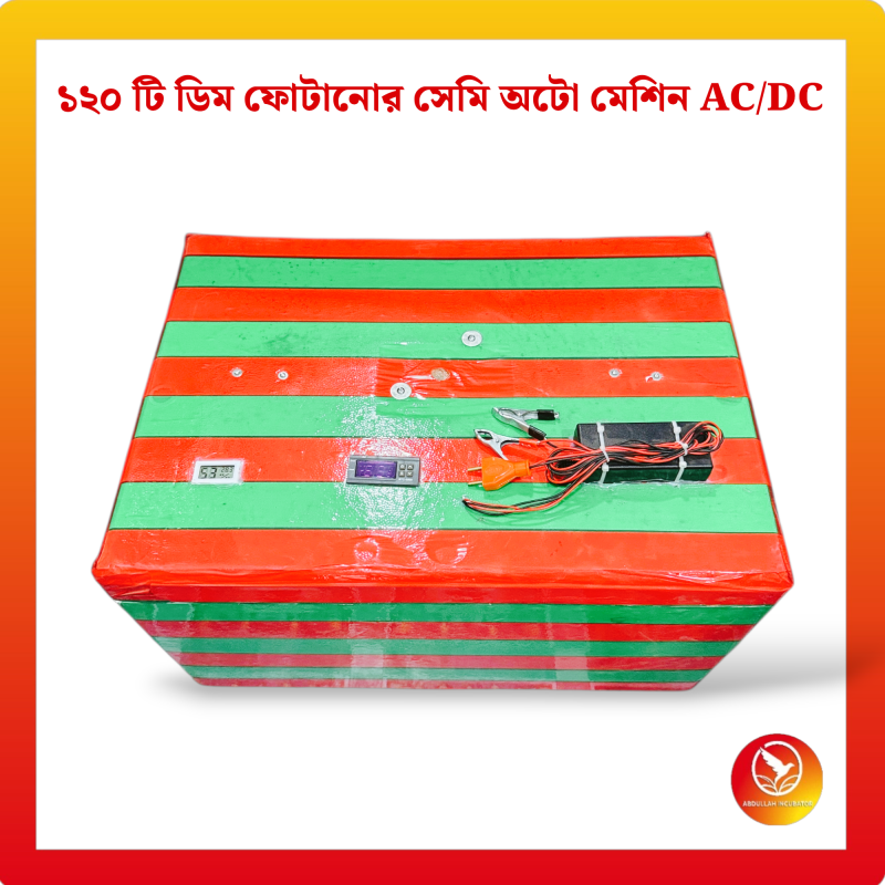 ১২০ ডিমের ইনকিউবেটর মেশিন হলো একটি আধুনিক ডিম ফোটানোর যন্ত্র, যা ১০০% সফলভাবে বাচ্চা ফোটাতে সক্ষম। মেশিনটিতে স্বয়ংক্রিয় টেম্পারেচার কন্ট্রোল, আর্দ্রতা নিয়ন্ত্রণ ব্যবস্থা এবং বিদ্যুৎ সাশ্রয়ী হিটিং সিস্টেম রয়েছে।